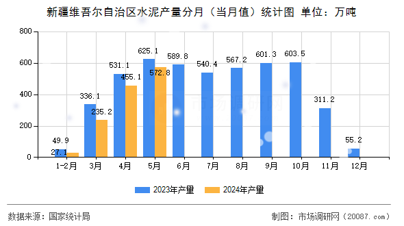 图1:新疆维吾尔自治区水泥产量分月(当月值)统计图