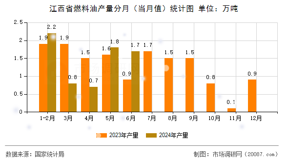 据国家统计局最新数据,2024年6月江西省规模以上工业企业燃料油产量同比增长了74.9%,达1.7万吨,增速较2023年同期高73.5个百分点,继续保持增长,增速较同期全国高94.0个百分点,约占同期全国规模以上企业燃料油产量361.4万吨的比重为0.5%。